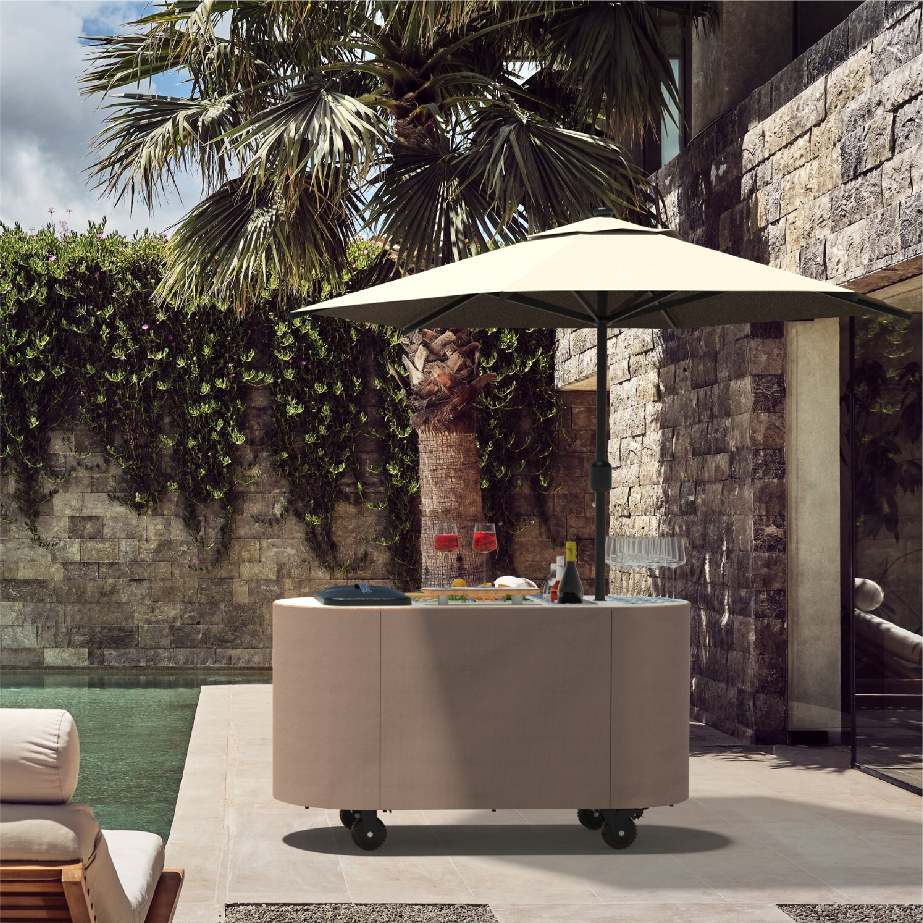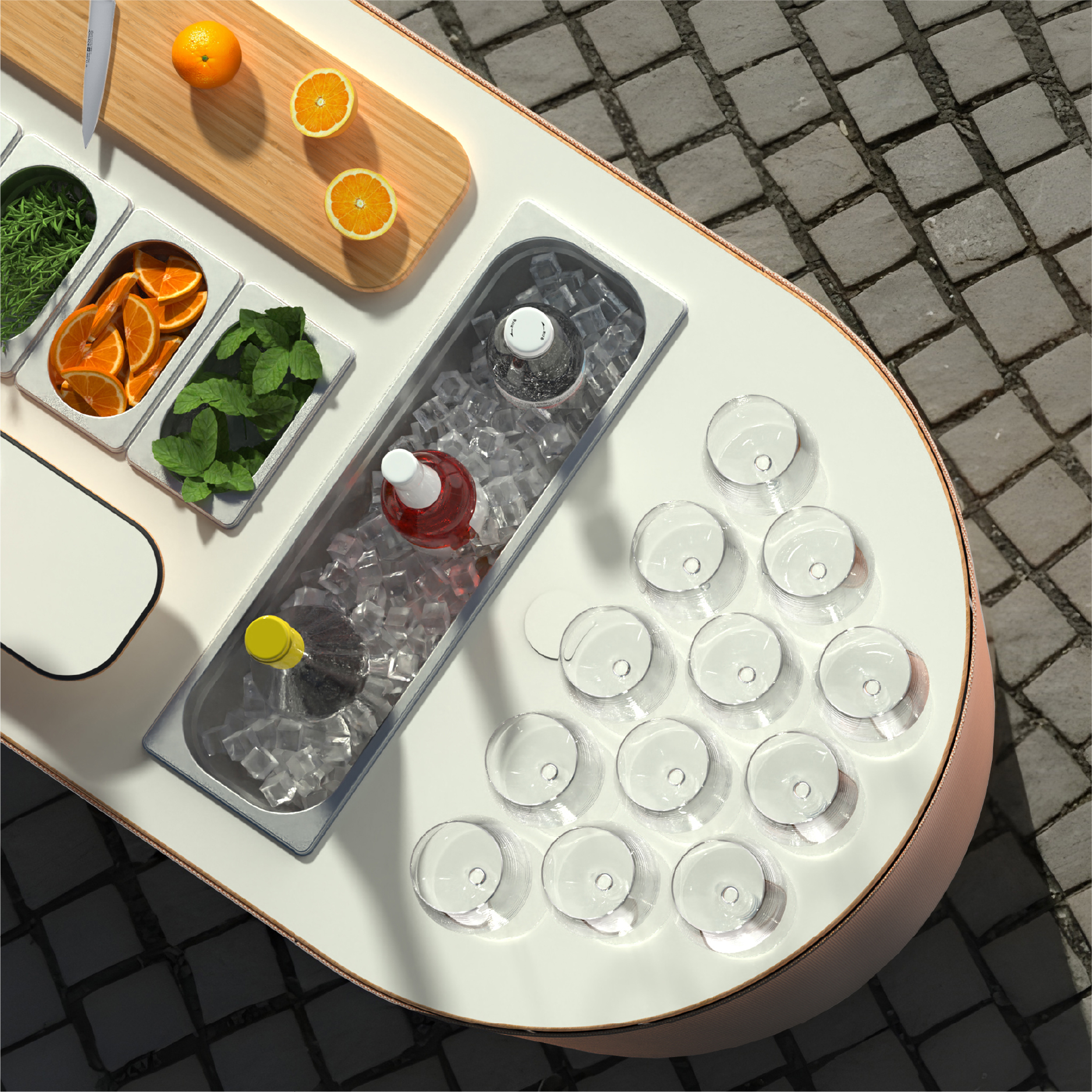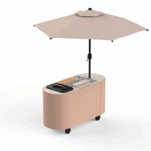 A mobile mixology stand that’s sleek yet fun, the cocktail setup makes serving drinks as stylish as it is effortless. Outfitted with a professional cutting board, a wine glass shelf, an ice bin, and storage for tools and ingredients, it’s built for both speed and showmanship.